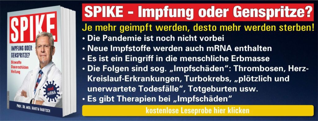 am 16. Oktober erschien nun endlich das sehnlichst erwartete Buch von Dr. Martin Haditsch „Spike – Impfung oder Genspritze?“, das extrem guten Anklang gefunden hat – die zweite Auflage wurde gestern bereits in Auftrag gegeben. Das liegt natürlich an Dr. Haditschs ausgezeichnetem Ruf – ganz besonders in Österreich –, den er sich nicht nur durch seine regelmäßigen Vorträge und Interviews erarbeitet hat, sondern vor allem durch den Erfolg der vierteiligen ServusTV-Doku „Corona – auf der Suche nach der Wahrheit“, die ja vor zwei Jahren ganz Österreich aufgerüttelt hat.